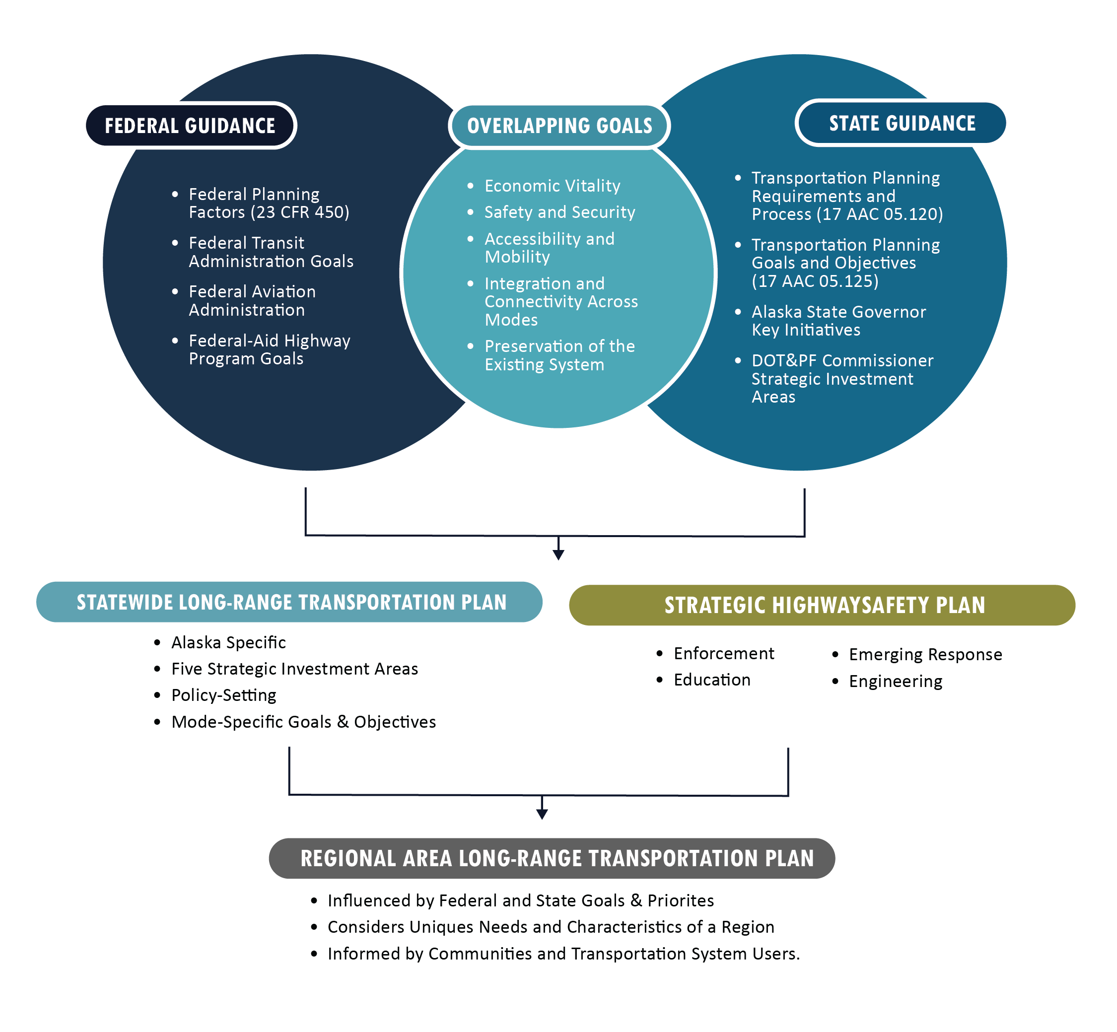 Statewide transportation planning is the process of developing a strategy for how the Alaska DOT&PF will implement the state’s transportation strategies, projects, and services throughout Alaska. This planning process comprehensively considers several planning factors, as defined by USC, the guidance in the US Code of Federal Regulations (CFR), and the Alaska Administrative Code (AAC), Title 17 - Transportation, Section 05.125.